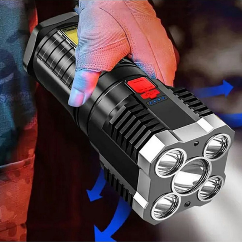 Taktikaline taskulamp, millel on 5 võimsat T6 tüüpi LED-dioodi, on paigutatud väga vastupidavasse korpusesse. Taskulambil on äärmiselt tugev valgusallikas, mis tagab pika tööea. Tugev reljeefne korpus tagab kindla haarde ja mugava kasutamise. Taskulamp on nii veekindel kui ka põrutuskindel. Lüliti ja USB-port on kaitstud vastupidava kummiga ning kasutatud O-rõngad hoiavad seadme puhta ja tolmuvabana. Küljele on paigaldatud lisad LED-dioodid. Sisseehitatud aku laetakse kaasasoleva USB-kaabli abil ning laadimistaset näitab LED-indikaator.