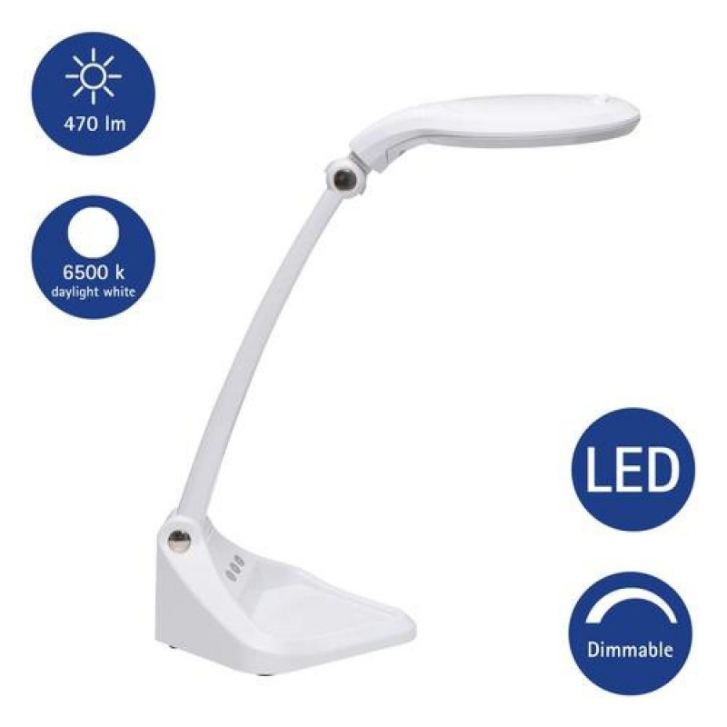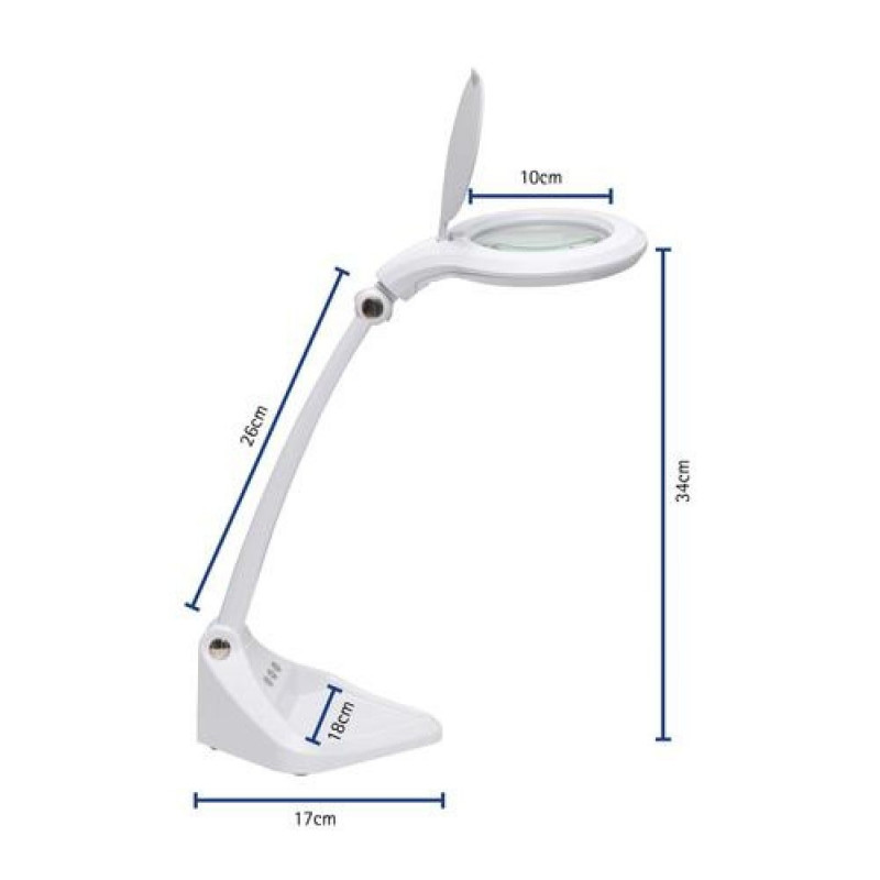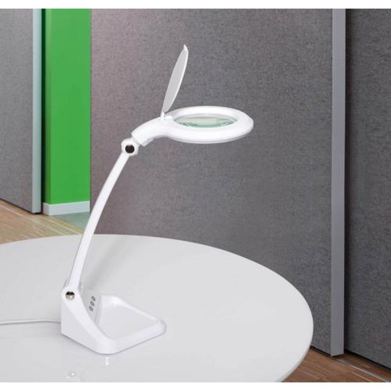For the price-conscious<br>Variably dimmable<br>Practical: storage shelf in the foot for small items, e.g. maulys<br>Extremely economical: state-of-the-art LED technology<br>Uniform illumination by LEDs arranged in a ring shape<br>Ideal for precision work in laboratories, workshops, technical offices, medical practices. Or in the private domain for stamp collectors, precision mechanics or as a reading magnifier<br>Technical safety concept Made by MAUL<br>Compact form: space saver and easy-to-handle<br>2-fold benefit: Magnifier and functional workplace lamp<br>Protected: includes protective flap that prevents exposure to sunlight and the accumulation of dust<br>3 diopter lens (1,75x magnification), Ø 4' (10 cm) and additionally embedded 12 diopter real glass lens (4x magnification), Ø 1' (2.5 cm), lens area 78,5 cm²<br>Sturdy plastic stand<br>Touch control panel on lamp head for convenient dimming, switching on and off<br>Illuminance of the lamp:<br>2160 lux illuminance at 34 cm distance<br>Colour temperature per light source:<br>6500 Kelvin (daylight white)<br>Number of light sources:<br>1<br>Energy efficiency class per light source:<br>G (spectrum A to G)<br>Weighted energy consumption per light source:<br>6 kWh/1000 h<br>Life per light source (L70B50):<br>20000 h<br>Useful luminous flux per light source:<br>502 Lumen<br>Base:<br>Base<br>Material:<br>Arm: plastic - Foot: plastic - Base: weight inlay, desk protection pad<br>Dimensions:<br>Height: 34 cm - Arm: length 26 cm - Head: Ø 14,5 cm - Base: 17x18 cm<br>Movement:<br>Head: inclinable, rotatable - Arm: inclinable<br>Position of the switch:<br>Base<br>Environmentally friendly and safe packaging, recyclable<br>Technical safety concept Made by MAUL: we never include a lamp or illuminant in our range unless it has successfully passed intensive testing. The safety of the Magnifying LED lamp MAULiris, dimmable is guaranteed by our optical, electronic and mechanical development team as well as production engineering teamMAUL 8261202. Product colour: White