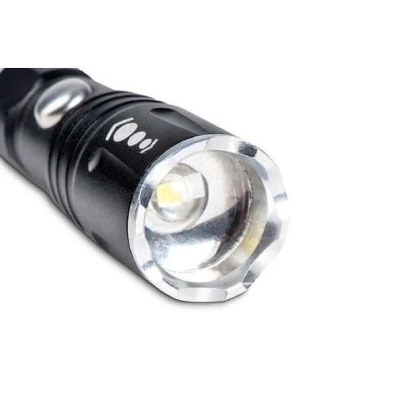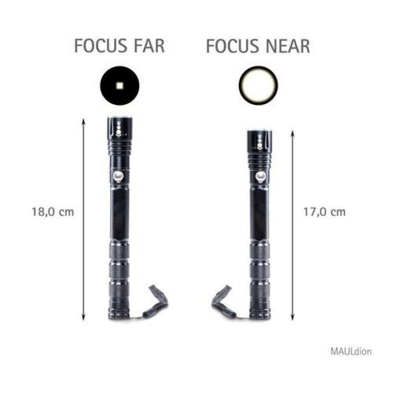 Slim, light model, length 17 cm<br>Loss-protected: including practical hand strap<br>High luminous range and handy size<br>Suitable for outdoor use, splash-proof (IPX4)<br>Including 2 x 1,5 V batteries (type AA) 2300 mAh<br>Variable: adjustable light cone (zoom function) for large area near light or focused far light beam<br>For semi-professional use, for hobby and private applications, for occasional use or the emergency<br>Luminous flux 39 Lumen, daylight white light, luminous range up to 71 m<br>Light duration 6 h<br>Extremely economical: modern LED technology<br>Ideal for occasional use e.g. by craftsmen, for repair work, when walking in the dark or for camping<br>Head Ø 2,3 cm, with roll-away protection, lens made of high-quality, crystal- clear plastic<br>Reflector opening: Ø 1,8 cm<br>Robust housing construction, black anodized aluminium, corrosion resistant<br>Sophisticated: housing with non-slip structure for a secure grip, Ø 1,9 cm<br>Practical: free-standing hand lamp, can be used e.g. as table light on an even surface<br>One-handed operation: push button laterally on the front side<br>Quick and convenient adjustment of the light cone by moving the reflector forward or backward<br>Please note: safety instructions for MAUL flashlights in the download area<br>Kompetent: Qualität von MAUL, dem Markenunternehmen mit über 20 Jahren Erfahrung in der LeuchtenherstellungMAUL 8186690. Product colour: Black. Weight: 50 g
