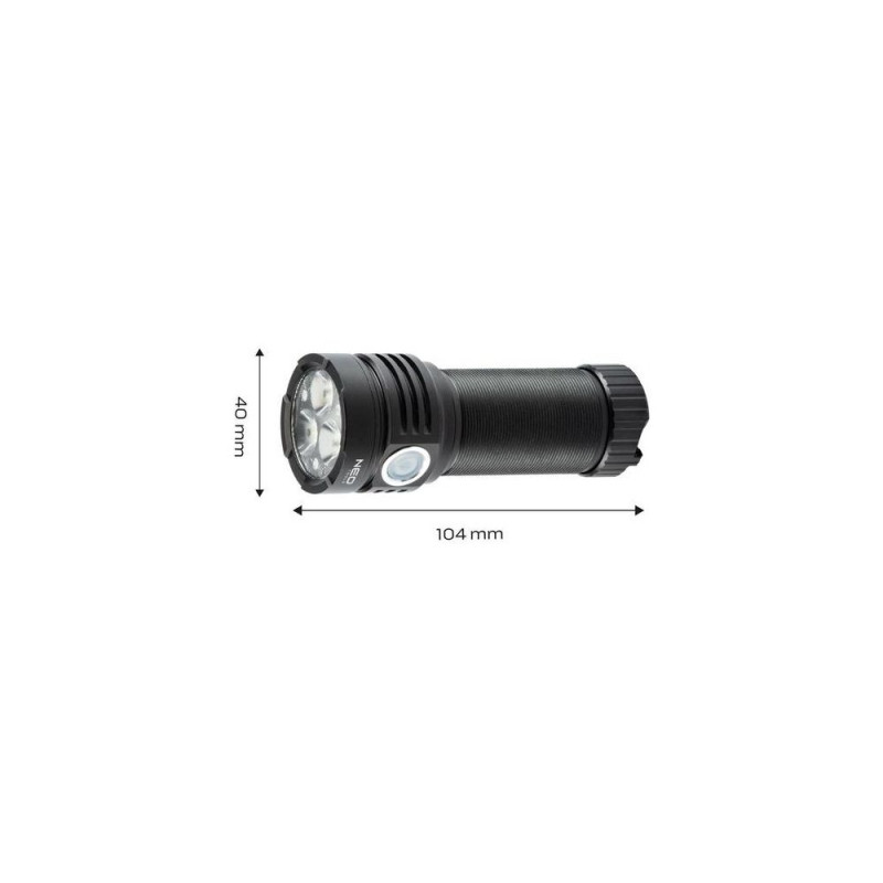 NEO cordless torch (ref. 99-037) is equipped with modern OSRAM P9 LEDs with a luminous flux of 3300 lumens and power of 30W. The maximum range is 220m. The torch is powered by the included 3.7V Li-Ion battery with a capacity of 4000 mAh. The body is made of aluminium. The torch has 5 light functions: 100%, 40%, 10%, 3% and strobe. The set includes a USB cable.NEO tools 99-037. Depth: 104 mm, Weight: 204 g. Quantity per pack: 1 pc(s)
