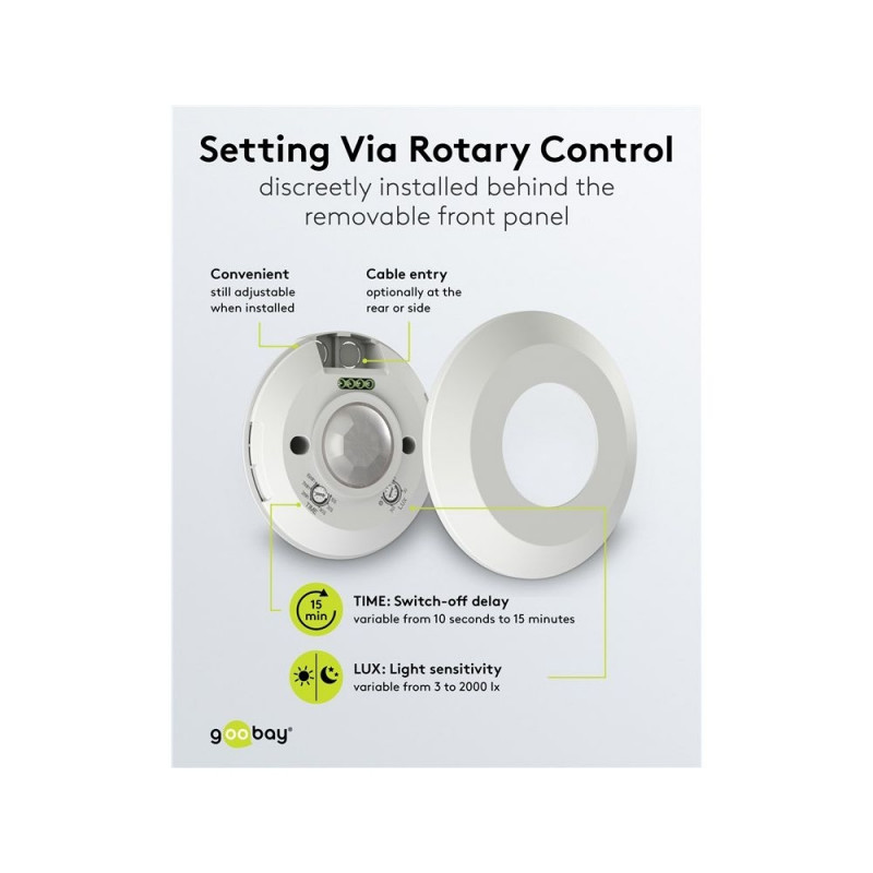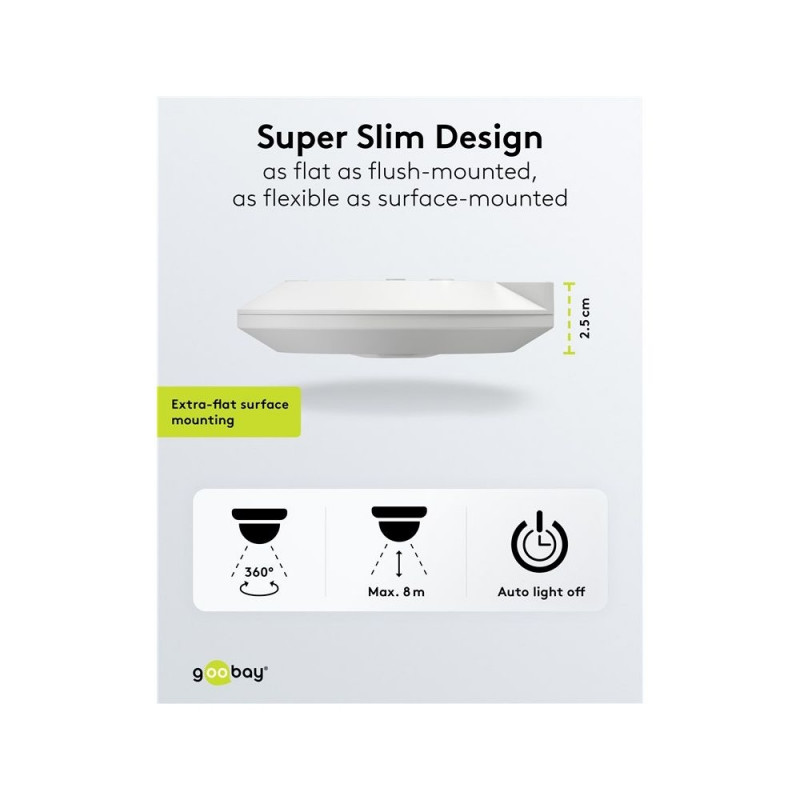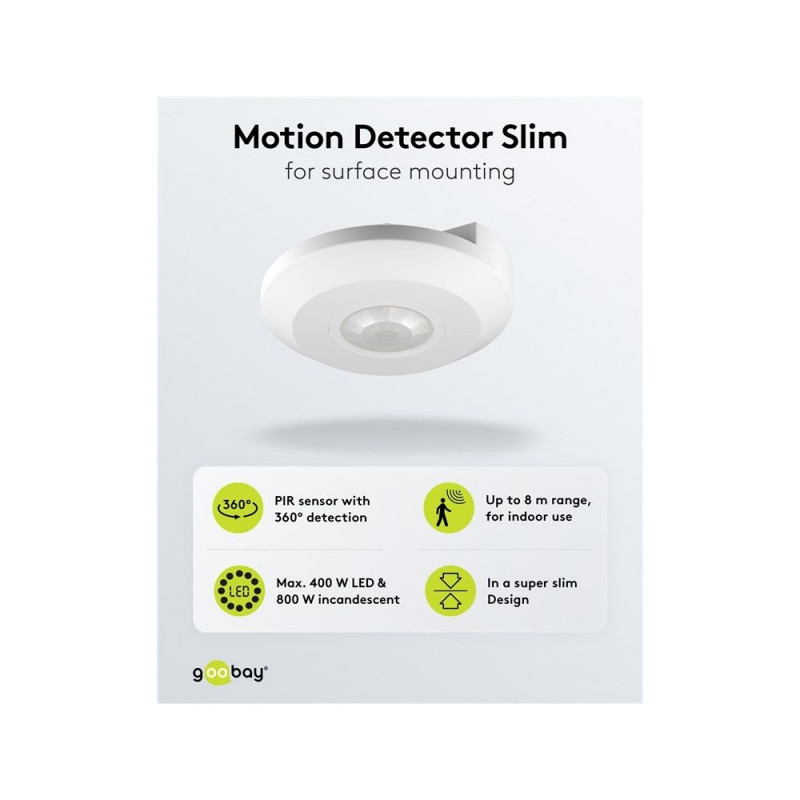| Description | Would you like a surface-mounted solution, but don't want a bulky device on the ceiling? No problem, this motion detector is a sensational 25 mm flat and therefore very discreet. It is extremely easy to operate: The white cover conceals the rotary control |