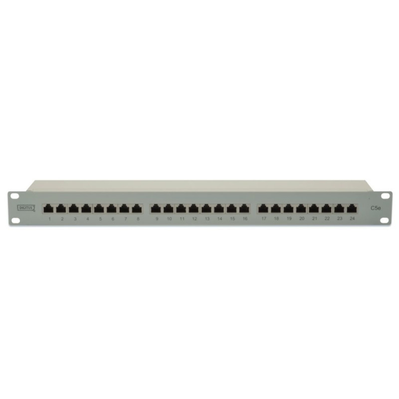 CAT 5e, Class D patch panel, shielded, 24-port RJ45, 8P8C, LSA, 1U, rack mount, grey, - Transmission properties: Category 5e - Area of application: Up to 100 MHz, 10/100Base-T, 1GBase-T - Norms: ISO/IEC 11801 3rd Ed., EN 50173-1, EIA/TIA 568-C - Suitable for 483 mm (19") cabinet mounting - RJ45 female, 8P8C - Cable installation via LSA strips, color coded according to EIA/TIA 568 A & B - Cable fixing with smart cable ties - Central ground connection - 360° shield coverage - Housing material: 1.5 mm galvanic cold rolled steel, acc. to EN1.4301, UNS S30400, AISI 304 and LMSAD110 - RJ45 female material: ABS UL 94V-0 - RJ45 female contact: Tinned phosphor bronze, 0.5 µ gold-plated contact - RJ45 shielding: Tinned bronze - LSA termination clamp: Krone LSA+, UL 94V-2, zinc plated phosphor bronze - Ground wire: Not included - Conductor plate: FR4, UL 94V-0 - Insertion force: 30N max. (IEC 60603-7-5) - Retention strength: 7.7 kg between jack and plug - Operation temperature: -20° C to +70 °C (ISO/IEC 11801, EN 50173-1, ANSI/TIA/EIA 568 C) - Mating cycles female: > 750 acc. to ISO/IEC 11801, IEC 60603-7-5 - Clamp: > 200 acc. to ISO/IEC 11801, IEC 60603-7-5 - IDC wire size: 22 – 26 AWG solid and stranded conductor - Insulation resistance: > 500 MOhm - Contact resistance: < 20 MilliOhm - Dielectric strength: 1000 VDC (Contact/Contact), 1500 VDC (Contact/Ground) - Color: light grey, RAL 7035 - Ports: 24 - Category: CAT 5e
