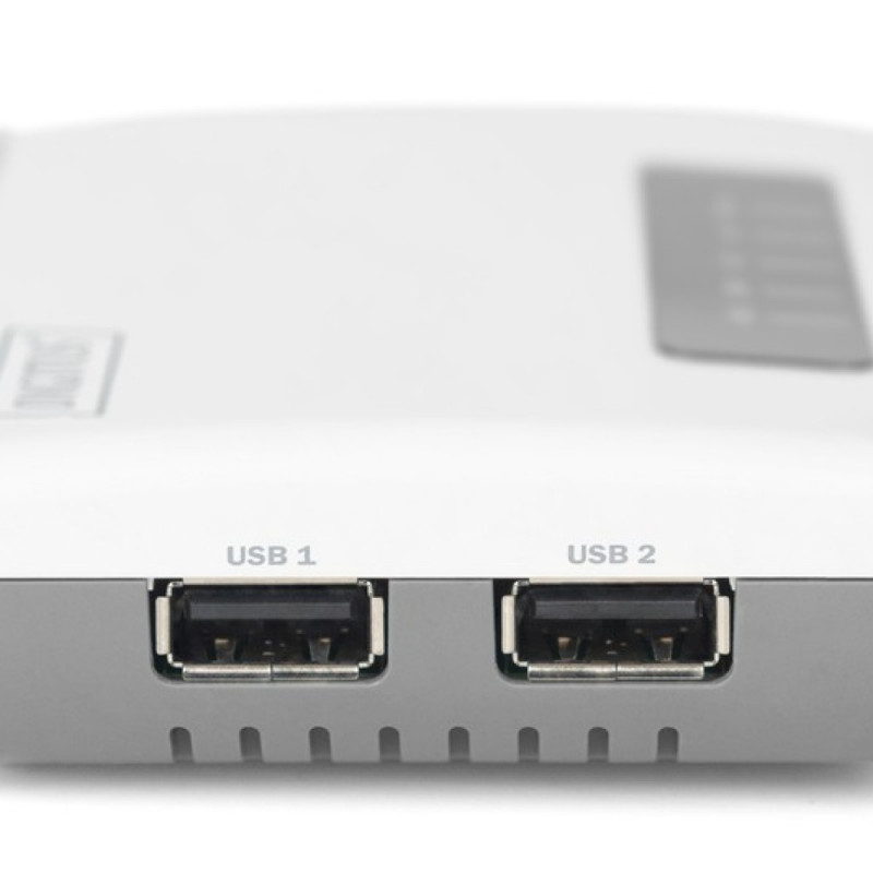 DIGITUS 2-port multi-funktsionaalne traadita USB 2.0 võrguserver võimaldab teil kasutada USB-seadmeid ilma otseühenduseta arvuti või sülearvutiga. Pääsege USB-seadmetele juurde kõikjal oma kohalikus võrgus, sünkroonige nutitelefone või installige printeri draivereid kaugjuhtimisega. Lisaks saate võrgu kaudu juurde pääseda ühilduvate USB-seadmete mälule, nagu multifunktsionaalsed printerid või välised kõvakettad. See võrguserver saavutab kiirused kuni 300 Mbps ja saab ühendada kõik USB-seadmed traadita. Ühendatud lõppseadmeid ja mitmeotstarbelist traadita võrguserverit saab põhjalikult konfigureerida kasutajasõbraliku veebiliidese kaudu. Muutke ükskõik milline ühilduv USB-seade võrguseadmeks ja kasutage seda kaugjuhtimisega.