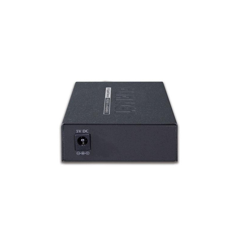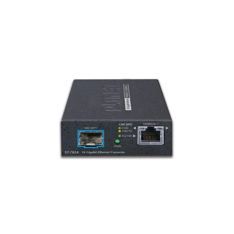 <b>Flexible and Reliable Network Distance Extension Solution</b><br>PLANET XT-705A Media Converter is equipped with one 10G/5G/2.5G/1G/100BASE-T auto-negotiation port and one 10GBASE-X SFP+ slot. It supports 10Gigabit Ethernet media conversion from copper 10GBASE-T to fiber multi-mode or single-mode, utilizing 10GBASE-SR or 10GBASE-LR SFP+ transceiver installed in the SFP+ slot to extend distances to servers, switches and patch panels. The deployment distance can be extended from 300 meters (multi-mode) to up to 60 kilometers (single-mode).They are designed for use in network environments where the ultra-high bandwidth provided by 10Gigabit Ethernet is required, for example, data center cloud computing, enterprise backbones, campus networks, and carrier infrastructure.<br><br><b>High Performance 10Gbps Ethernet Capacity</b><br>The XT-705A offers wire-speed packets transfer performance without the risk of packet loss. The high data throughput of the device makes it ideal for most Gigabit environments. With a 20Gbps internal fabric,16K jumbo frame feature and auto negotiation support in its 10 Gigabit port, the XT-705A can handle extremely large amounts of data transmission in a secure topology linking to data center cloud computing, enterprise backbones, campus networks, and carrier infrastructure.<br><br><b>Robust Protection</b><br>The XT-705A provides contact discharge of ±6KV DC and air discharge of ±8KV DC for Ethernet ESD protection. It also supports ±4KV surge immunity to improve product stability and protects users’ networks from devastating ESD attacks, making sure the flow of operation does not fluctuate.<br><br><b>Low Power Consumption</b><br>The XT-705A adopting the advanced chip technology has the power-saving feature like a low power consumption of only 3.75 watts when in full operation.<br><br><b>Easy Chassis Installation</b><br>The XT-705A Media Converter can be used as a stand-alone unit or as a slide-in module to the PLANET Media Converter Chassis (MC-700 and MC-1500 chassis series). The media chassis can assist in providing DC power to the XT-705A Media Converter to maintain the fiber-optic network at one centralized location. It can be DIN-rail or wall mounted for efficient use of cabinet space.<br><br><b>Fiber-optic Linking Capability Enables Extension of Network Deployment</b><br>The SFP+ slot of the XT-705A is compatible with 10GBASE-SR or 10GBASE-LR (Small Form Factor Pluggable) fiber-optic transceivers. The fiber optic uplink capability guarantees the throughput to all nodes hooked into the network and the 10 Gigabit Ethernet distance can be extended from 300 meters (multi-mode fiber cable) to 10/40/60 kilometers (single-mode fiber cable). It is ideal for applications within the factory data centers and distributions.PLANET XT-705A. Maximum data transfer rate: 10000 Mbit/s, Networking standards: IEEE 802.3ab, IEEE 802.3ae, IEEE 802.3an, IEEE 802.3bz, IEEE 802.3u, IEEE 802.3x, Ethernet interface type: 2.5 Gigabit Ethernet, 5 Gigabit Ethernet, 10 Gigabit Ethernet, Fast Ethernet, Gigabit Ethernet. Fiber optic connector: SFP+, Connectivity technology: Wired. Maximum transfer distance: 60000 m, Fiber mode structure: Multi-mode, Single-mode, Fiber cable diameters supported (core/cladding): 9/125,50/125,62.5/125 µm. LED indicators: Link, Power, Housing material: Metal, Certification: FCC Part 15 Class A, CE. Input voltage: 5 V, Input current: 2 A, Power consumption (typical): 26 W