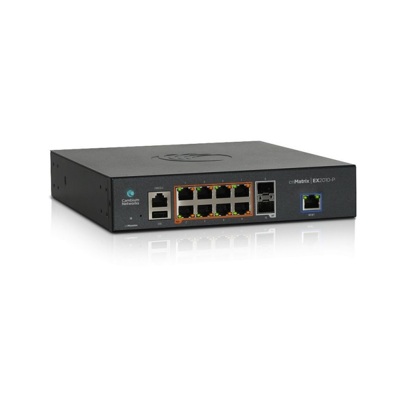 Cambium Networks cnMatrix EX2010-P. Lüliti tüüp: Hallatav, lülitustase: L2/L3. Põhilülituse RJ-45 Etherneti portide tüüp: Gigabit Ethernet (10/100/1000), põhilülituse RJ-45 Etherneti portide arv: 8, USB 2.0 portide arv: 1, konsoolipord: RS-232. Täisdubleks. MAC-aadresside tabel: 16 000 kirjet, ruuteri/lüliti läbilaskevõime: 20 Gbit/s. Võrgustandardid: IEEE 802.1D, IEEE 802.1Q, IEEE 802.1p, IEEE 802.1s, IEEE 802.1w, IEEE 802.1x, IEEE 802.3, IEEE... Power over Ethernet (PoE). Räkkpaigaldus, vormitegur: 1U