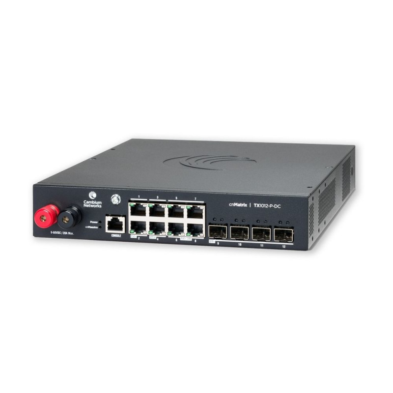Cambium Networks cnMatrix Switch TX1012-P-DC. Lüliti tüüp: Hallatav, lüliti tase: L2/L3. Põhiliste RJ-45 Ethernet portide tüüp: Gigabit Ethernet (10/100/1000), põhiliste RJ-45 Ethernet portide arv: 8, konsoolipordi tüüp: RS-232. MAC-aadresside tabel: 16 000 kirjet, marsruutimis-/lülitusvõimsus: 1000 Gbit/s. Alalisvoolu sisendpinge: 24–56 V. Toitepistik: alalisvoolu ühendus. Power over Ethernet (PoE). Paigaldatav rack-kappi.