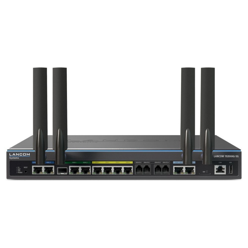 LANCOM 1926VAG-5G (EU). Toote värvus: must, rack’i maht: 1U, korpuse materjal: metall. Antenni tüüp: väline. Ruuteri protokollid: BGP4, LISP, OSPFv2, RIP-2, VoIP protokollid: RTP, SIPS, SRTP, toetatud protokollid: DNS, HTTP, HTTPS, ICMP, NTP/SNTP, NetBIOS, PPPoE (server), RADIUS, RADSEC (turvaline RADIUS), RTP,.... Etherneti LAN andmeedastuskiirused: 10, 100, 1000 Mbit/s, võrgustandard: IEEE 802.1Q, IEEE 802.3az, mobiilsidevõrgu põlvkond: 5G. Toetatud turvaalgoritmid: SRTP, autentimismeetodid: PAP, CHAP, MS-CHAP, MS-CHAPv2.