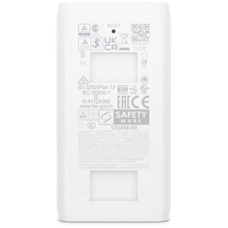 Ubiquiti U-POE-AF. Etherneti liidese tüüp: Gigabit Ethernet, Etherneti LAN andmeedastuskiirus: 1000 Mbit/s. Toote värvus: valge. Power over Ethernet (PoE) pinge: 48 V, sisendpinge: 100–240 V, sisendsagedus: 50/60 Hz. Sertifikaadid: CE, FCC, IC, UL. Laius: 46 mm, sügavus: 86 mm, kõrgus: 33 mm.
