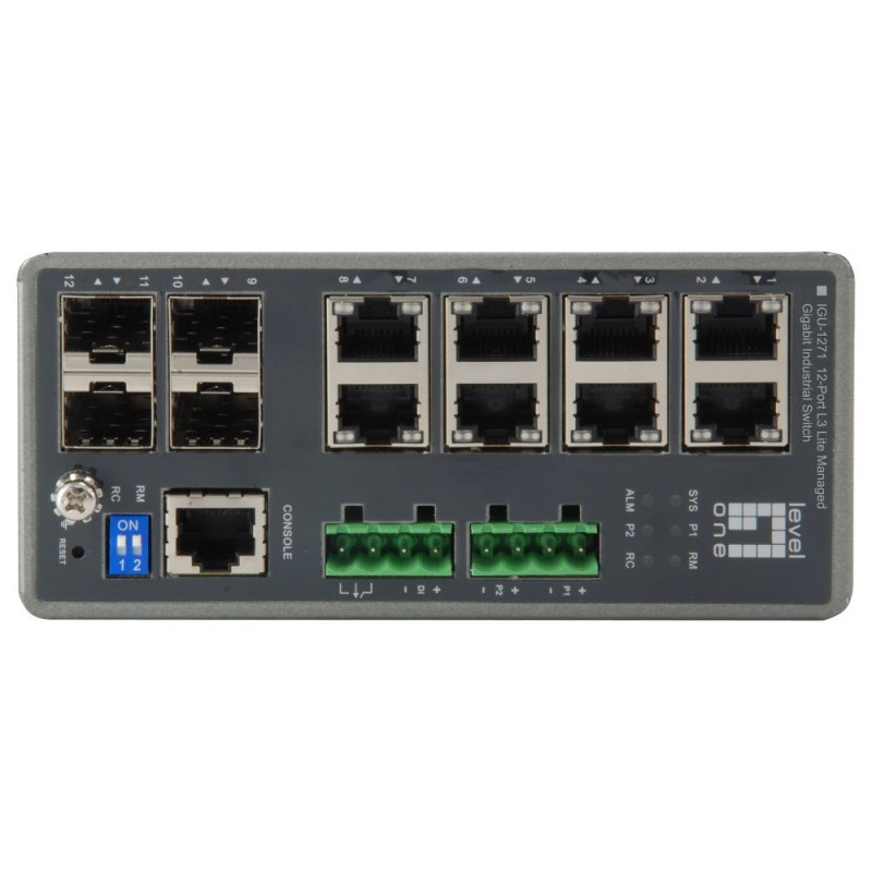 "LevelOne IGU-1271. Lüliti tüüp: Hallatav, Lüliti tase: L3. Põhilised RJ-45 Etherneti pordid: Gigabit Ethernet (10/100/1000), Põhiliste RJ-45 Etherneti portide arv: 8, Konsolipordi tüüp: RJ-45. MAC-aadresside tabel: 8000 kirjet, Suunamis-/lülitusvõimsus: 24 Gbit/s. Võrgustandardid: IEEE 802.1D, IEEE 802.1Q, IEEE 802.1ab, IEEE 802.1ag, IEEE 802.1p, IEEE 802.1s, IEEE 802.1w, IEEE.... Alalisvoolu sisendpinge: 48 - 57 V"