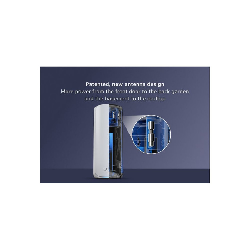 "NETGEAR Orbi 870. Toote värvus: Valge, Antennitüüp: Sisemine, Maksimaalne katvus: 700 m². WiFi-sagedusribad: Kolme sagedusribaga (2,4 GHz/5 GHz/6 GHz), Maksimaalne WiFi andmeedastuskiirus: 11520 Mbit/s, WiFi andmeedastuskiirus (esimene riba): 11520 Mbit/s. Protsessori taktsagedus: 1,5 GHz, Mälu maht: 2000 MB, Välkmälu: 4000 MB. Laius: 146,8 mm, Sügavus: 112,4 mm, Kõrgus: 270,3 mm. Komplektis olevate toodete arv: 3 tk."