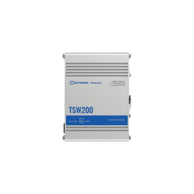TSW200 is industrial unmanaged switch from Teltonika Networks.<br><br>TSW200 is equipped with 2 SFP ports for long-range Fiber-optic communication and 8 Gigabit Ethernet ports which support IEEE802.3af and IEE802.3at Power-over-Ethernet standards.<br><br>Classified as power source equipment (PSE), it enables centralization of the power supply, providing up to 30 watts per port and reducing the effort for installing power. It has 10/100/1000 Mbps Ethernet ports to provide an economical high-bandwidth solution for your industrial Ethernet network.<br><br>This rugged unmanaged industrial switch is ideal for professional high bandwidth applications where it is necessary to provide both: reliable data connection and power supply.Teltonika TSW200. Switch type: Unmanaged. Basic switching RJ-45 Ethernet ports type: Gigabit Ethernet (10/100/1000), Basic switching RJ-45 Ethernet ports quantity: 8. MAC address table: 2000 entries. Networking standards: IEEE 802.3, IEEE 802.3af, IEEE 802.3at, IEEE 802.3az, IEEE 802.3u. DC input voltage: 7 - 57 V. Power over Ethernet (PoE). Wall mountable, Rack mounting