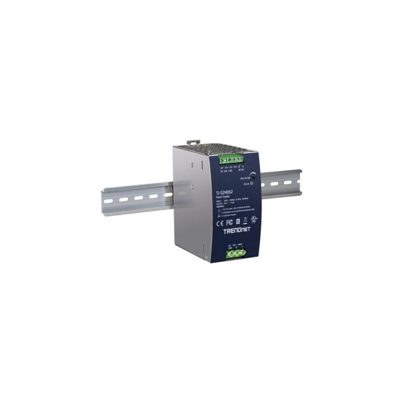 TRENDnet’s AC to DC Industrial DIN-Rail Power Supply with PFC Function, model TI-S24052, supplies up to 240W (52V DC, 4.61A) of power to industrial equipment, such as PoE switches, injectors, and WiFi access points. This industrial power supply supports active PFC to help eliminate unusable reactive power, and comes with an integrated DIN-Rail mount. It also supports protections for overload, short circuit, over voltage, over current, and over temperature. The industrial power supply is designed for industrial environments with an operating temperate range of -25° – 70° C (-13° – 158° F).Trendnet TI-S24052. Product type: Power supply, Product colour: Black, Power protection features: Over current, Over power, Over voltage, Overheating, Short circuit. Total power: 240 W, AC input voltage: 90 - 264 V, AC input frequency: 47 / 63 Hz. Compliance certificates: CE, RoHS, Certification: FCC UL 62368 CB IEC 62368 UL 508. Width: 63 mm, Depth: 124 mm, Height: 114 mm