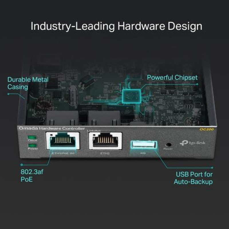 <b>Dedicated In Network Centralized Management</b><br>The OC200 Omada Cloud Controller delicate to provide centralized management for the whole Omada network. Monitor statistics in real-time, view a graphical analysis of network traffic, create a captive portal, upgrade and reboot your system, and easily scale your network to boost your business.<br><br><b>Free Cloud Management – Anywhere, Anytime</b><br>Omada offers free cloud access to its centralized management platform. Take your network with you, wherever you go.<br><br><b>Industry Leading Hardware Design</b><br>Equipped with an advanced hardware design and the latest chipset, OC200 has the impressive processing power to support the massive management of your business network.<br><br><b>Guest Network with Facebook Wi-Fi and SMS Login</b><br>Visitors have access to secure Wi-Fi with captive portal and wireless isolation technology. Newly added SMS authentication simplifies the connection process, while Facebook authentication raises the social media profile of your business.<br><br><b>Even More Convenient with Omada App</b><br>Remotely access and configure the OC200 from the convenience of your smartphone, wherever you are in the world.TP-Link Omada Hardware Controller. Product colour: Black. Antenna type: Internal. Processor frequency: 1200 MHz, Internal memory: 1024 MB, Internal memory type: DDR3. Ethernet LAN data rates: 10,100 Mbit/s, Networking standards: IEEE 802.3af, IEEE 802.3at. Security algorithms: SSID, WEP, WPA, WPA-PSK, WPA2, WPA2-PSK