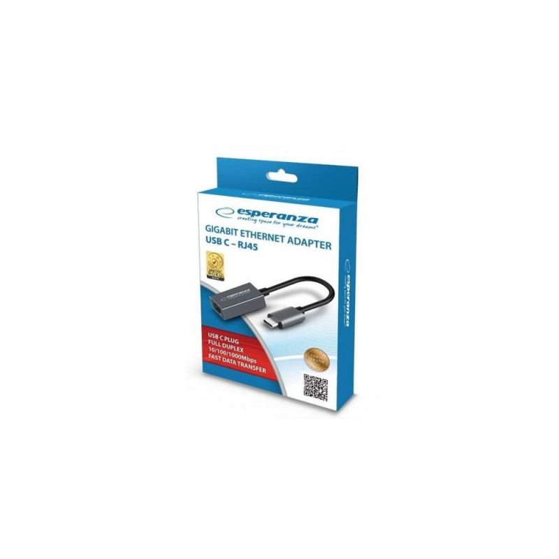 Network adapter with USB-C connector provides fast and highly stable LAN connectivity with data transfer speeds of up to 1000 Mbps (Gigabit). The adapter is backward compatible, allowing data transfer at lower Ethernet speeds (10 Mbps-100 Mbps). It is compatible with most operating systems and requires no drivers. Built-in LED indicators display connection status.Esperanza ENA102. Ethernet LAN data rates: 10,100,1000 Mbit/s, Cabling technology: 10/100/1000, Networking standards: IEEE 802.3, IEEE 802.3ab, IEEE 802.3u. Product colour: Graphite. Number of products included: 1 pc(s)