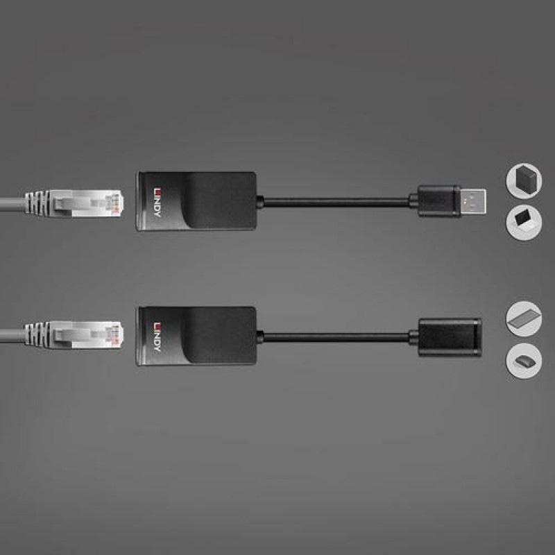 The Lindy Cat.6 USB Extender can be used to extend the distance between a USB device and a host computer by up to 60m. It consists of a local unit, which can be connected to the computer or laptop and a remote unit which connects to USB devices like mice or keyboards, perfect for long distance access.<br><br>Standard, low cost Cat.5e/6 cable (not included) is used to connect the two units together. For best performance and compatibility, we recommend the use of solid core patched cables.Lindy 60m USB 1.1 Cat.6 Extender Basic. Type: Network transmitter & receiver, Maximum transfer distance: 60 m, Data transfer rate: 12 Mbit/s. Product colour: Black, Housing material: Plastic, Certification: CE, FCC, RoHS & REACH, CP65. Weight: 54 g, Transmitter width: 5.3 cm, Transmitter depth: 2.6 cm. Package width: 180 mm, Package depth: 105 mm, Package height: 30 mm