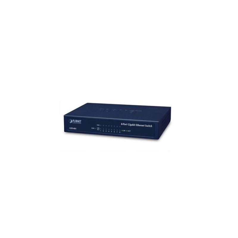 <b>Optimal Solution for Energy Saving and Gigabit High Performance</b><br>PLANET Green Networking Switch-GSD-803 is an ideal solution in line with the energy-saving trend worldwide. The GSD-803 is an 8-port Gigabit Ethernet Switch bringing both benefits of energy saving and Gigabit wire speed performance. It is specially designed for home networking, SOHOs and enterprises.<br><br><b>Energy Saving</b><br>The GSD-803 incorporates two advanced Green Networking technologies and is able to provide power saving up to 40% less energy but maintains high performance efficiently.<br><br>(1) Hibernation Link Down power saving<br>The Hibernation Link Down power saving goes beyond IEEE specifications to automatically lower power for a given port when it is not linked. With the Hibernation Link Down power saving technology, the GSD-803 will automatically adjust power usage of the ports that are shut down or not connected to network device.<br><br>(2) Intelligent scales power based on cable length<br>Intelligent scales power, the other technology adopted, is an intelligent algorithm that actively determines the appropriate power level based on cable length. When the GSD-803 is connected with Ethernet cable shorter than 20m, a device can obtain maximum power saving because the GSD-803 would automatically detect the Ethernet cable length and diminish power usage. The connected device can substantially reduce the overall power consumption, which makes a significant contribution to energy saving.<br><br><b>Leading Home, SOHO and Workgroup Users to High-speed Networking Generation</b><br>The GSD-803 is designed with modern metal compact housing and easy for deployment of high speed Gigabit networking in home or SOHO applications. Providing 16Gbps internal switching fabric, the GSD-803 can handle an extremely large amount of data in a secure topology linking to a backbone or high capacity servers. The GSD-803 provides 8K MAC address table, and wire-speed packet transfer performance without risk of packet loss. The high data throughput of the device makes it ideal for most Gigabit environments, especially for the network to be upgraded to a Gigabit environment.<br><br><b>Plug & Play</b><br>All RJ-45 copper interfaces of the GSD-803 support 10/100/1000Mbps auto-negotiation for optimal speed detection through RJ-45 Category 5, 5e or 6 cables. They support standard auto-MDI/MDI-X feature which can detect the type of connection to any Ethernet device without requiring special straight or crossover cables.PLANET GSD-803. Basic switching RJ-45 Ethernet ports type: Gigabit Ethernet (10/100/1000), Basic switching RJ-45 Ethernet ports quantity: 8. Full duplex. MAC address table: 4000 entries, Switching capacity: 16 Gbit/s. Networking standards: IEEE 802.3, IEEE 802.3ab, IEEE 802.3az, IEEE 802.3u, IEEE 802.3x. DC input voltage: 5 V. Power connector: DC-in jack. Wall mountable
