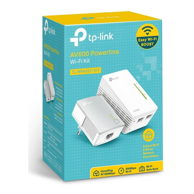 TP-Link AV600-300 Mbit/s WLAN Powerline Extender komplekt. Maksimaalne andmeedastuskiirus: 600 Mbit/s, võrgustandardid: IEEE 1901, IEEE 802.11b, IEEE 802.11g, IEEE 802.11n, IEEE 802.3, IEEE 802.3ab, IEEE 802.3u, pistik: tüüp E. Energiatarve (tavakasutuses): 5,2 W. Toote värvus: valge, antennitüüp: sisemine, LED-indikaatorid: LAN, PLC, toide, WLAN. Toetatud Windowsi operatsioonisüsteemid: Windows 10, Windows 7, Windows 8, Windows 8.1, Windows Vista, Windows XP. Toetatud Maci operatsioonisüsteemid: MacOS. Vastavussertifikaadid: RoHS.